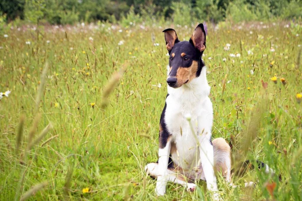 Un Colley à poil court assis sur une surface herbacée