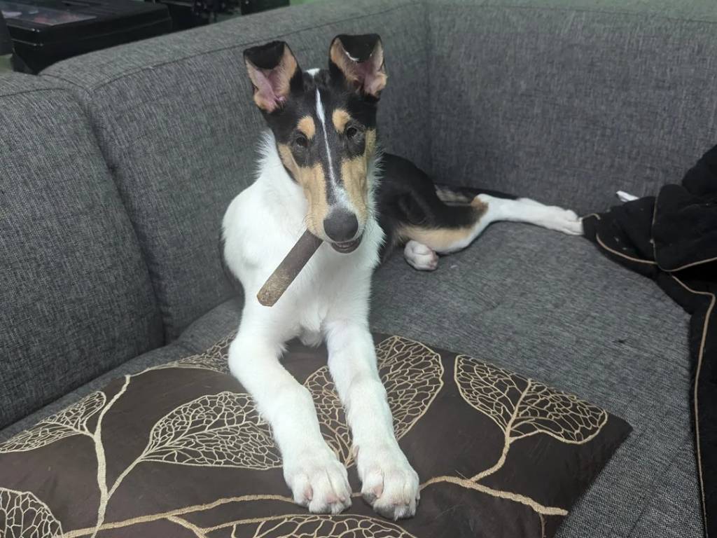 Un Colley à poil court allongé sur un canapé et tenant un objet dans sa gueule