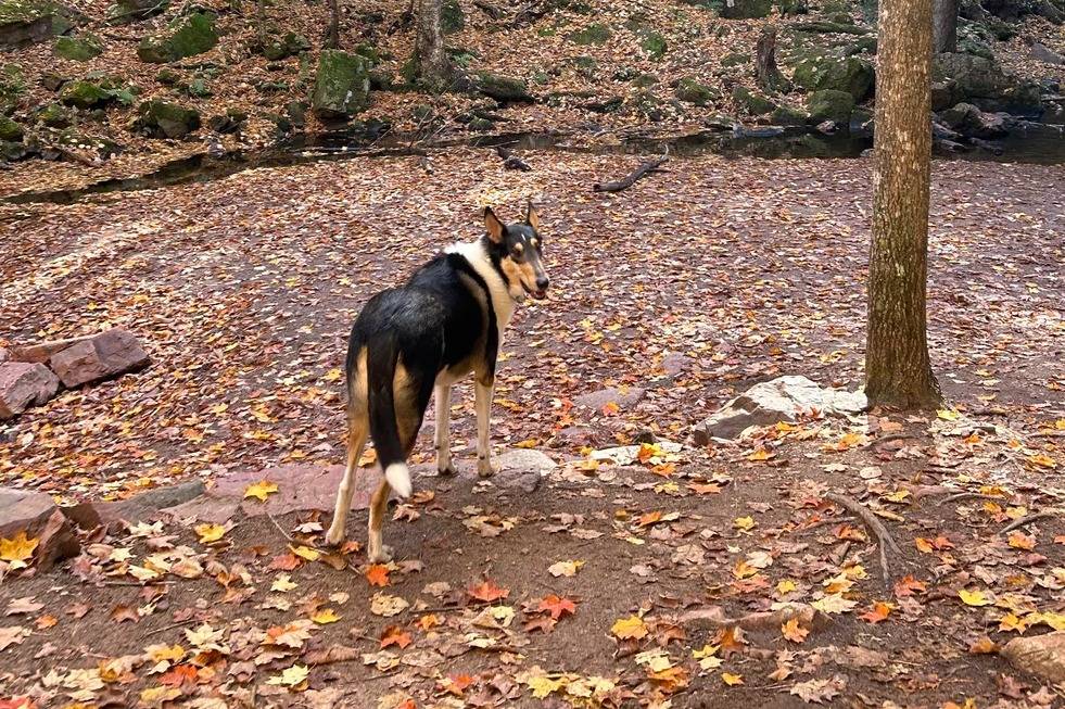 Un Colley à Poil Court sur un sol jonché de feuilles mortes
