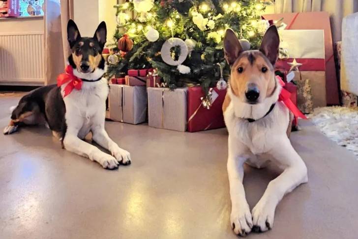 Deux Colley à poil court allongés sur du béton et portant chacun un collier autour du cou