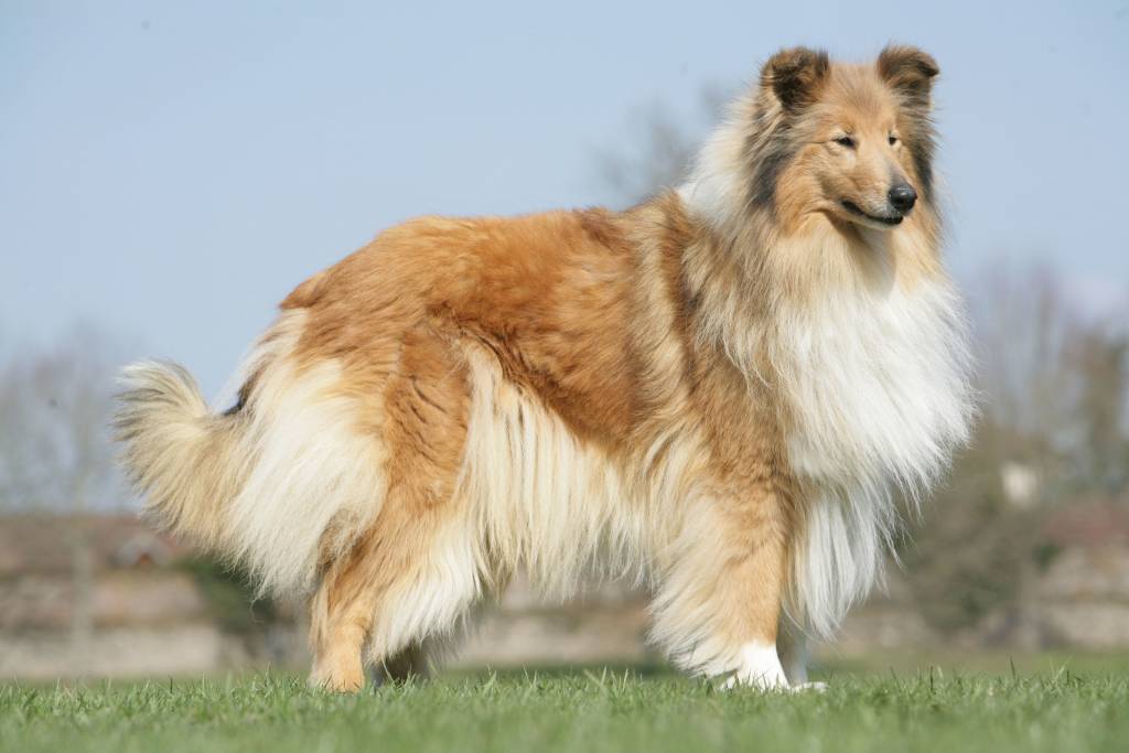 Un Colley debout dans l'herbe, dans un parc