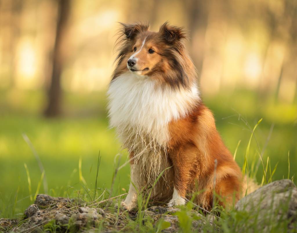 Un Colley à Poil Long assis sur un rocher dans un parc