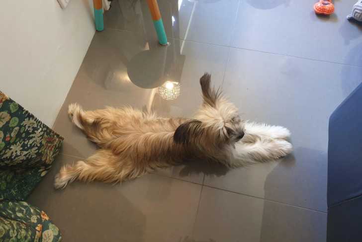 Un Crested Tzu allongé sur un sol carrelé et semblant détendu
