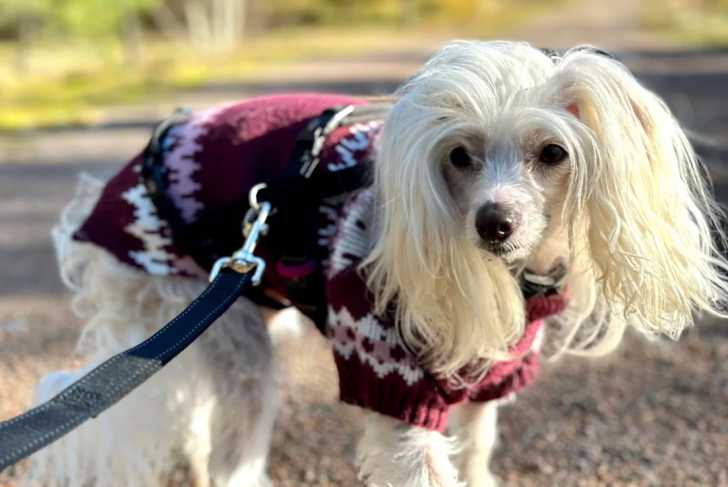 Un Crested Tzu portant un habit pour chien et qui est tenu en laisse