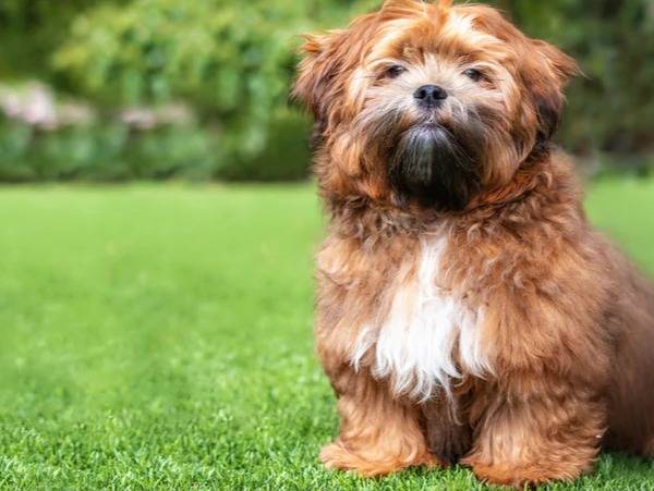 Un Daisy Dog assis sur une pelouse verte