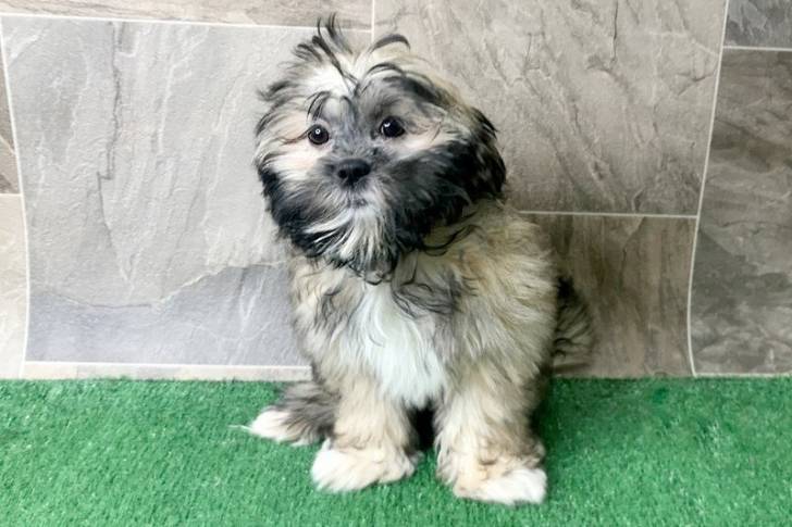 Un Daisy Dog assis sur un tapis vert avec un mur de carreaux en arrière-plan