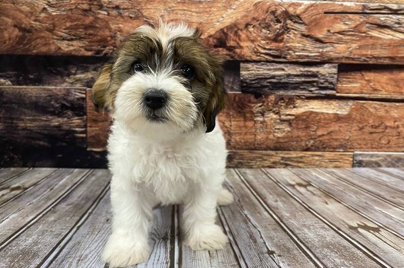 Un Daisy Dog assis sur un sol en bois gris devant un mur de bois rustique