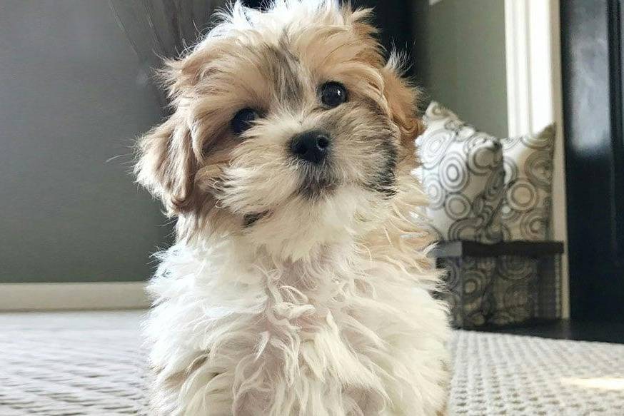 Un Daisy Dog assis sur une moquette avec une fenêtre en arrière-plan