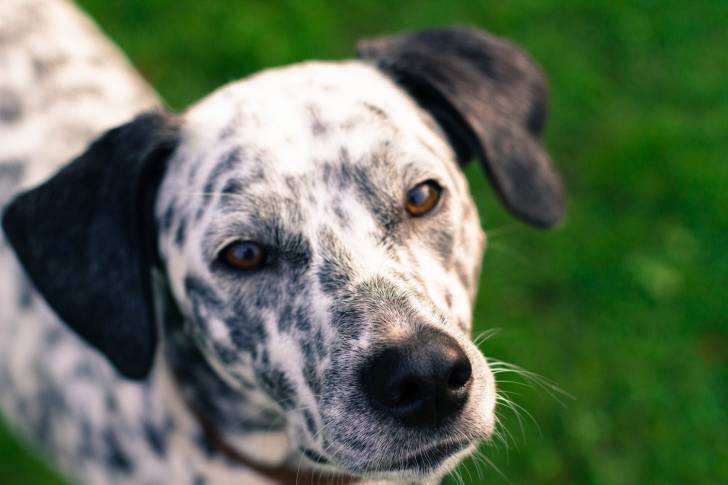 Un Dalmatien aux oreilles toutes noires qui regarde en l'air vers l'objectif