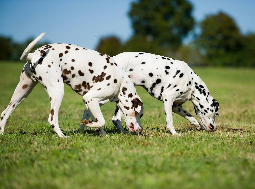 Deux Dalmatiens en train de suivre une piste dans un champ