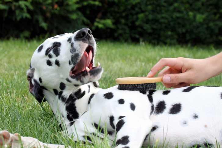 Un maître brosse le pelage de son Dalmatien