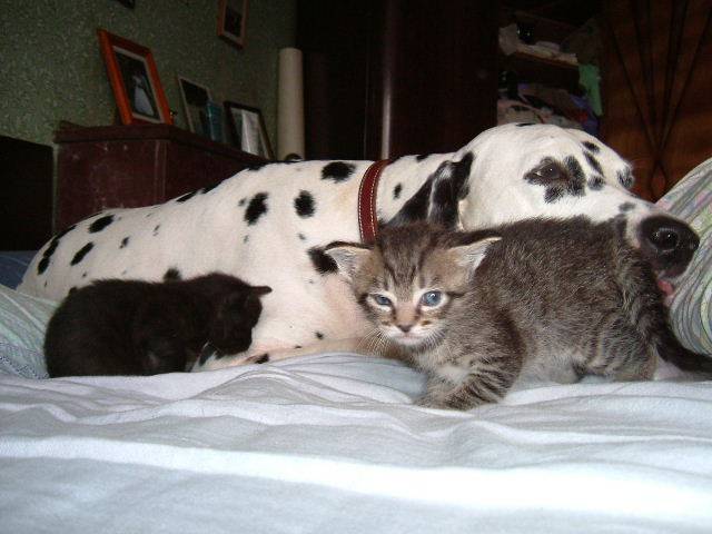 Un Dalmatien très câlin avec un chaton