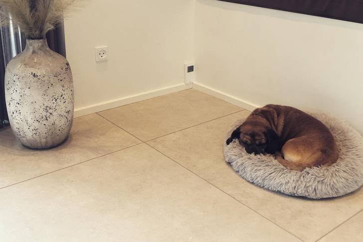 Un chien Daug termine sa sieste puis joue avec son propriétaire