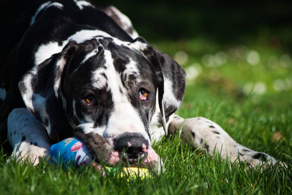 Un Dogue Allemand allongé dans l'herbe avec une peluche dans la gueule