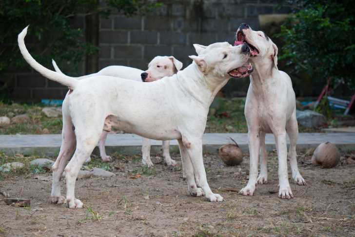 Plusieurs Dogues Argentins en promenade ensemble