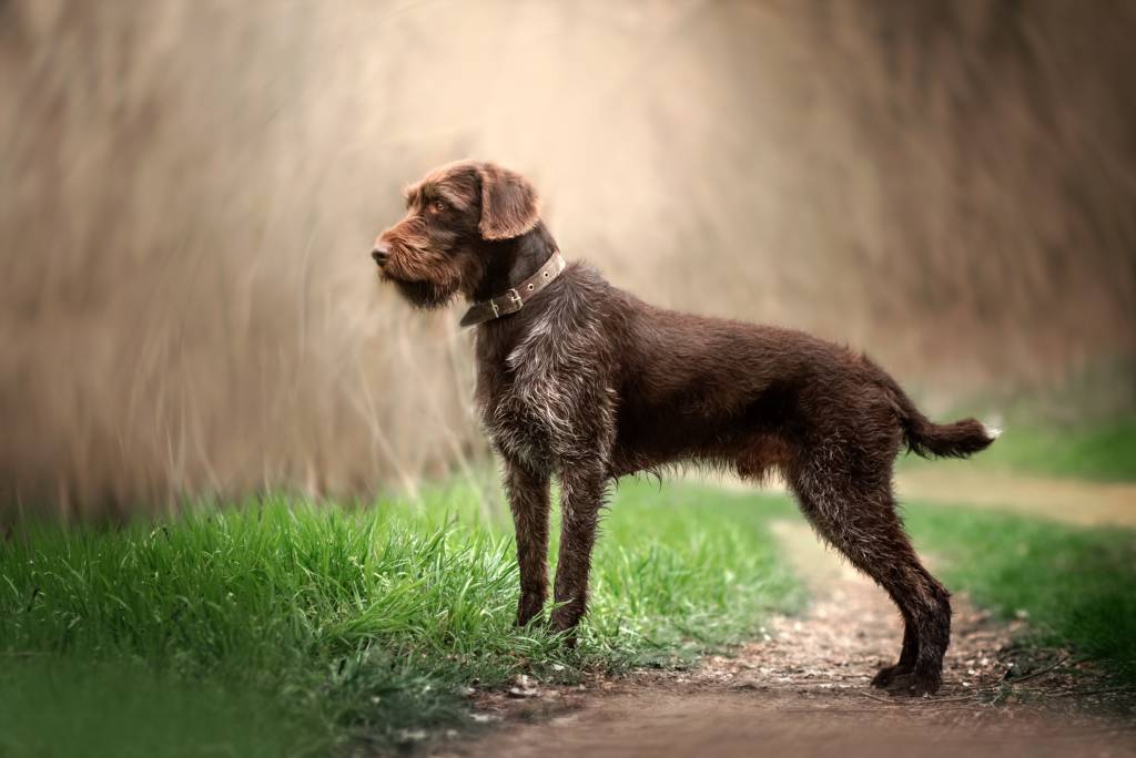 Un Drahthaar en position statique au milieu d'un sentier de terre