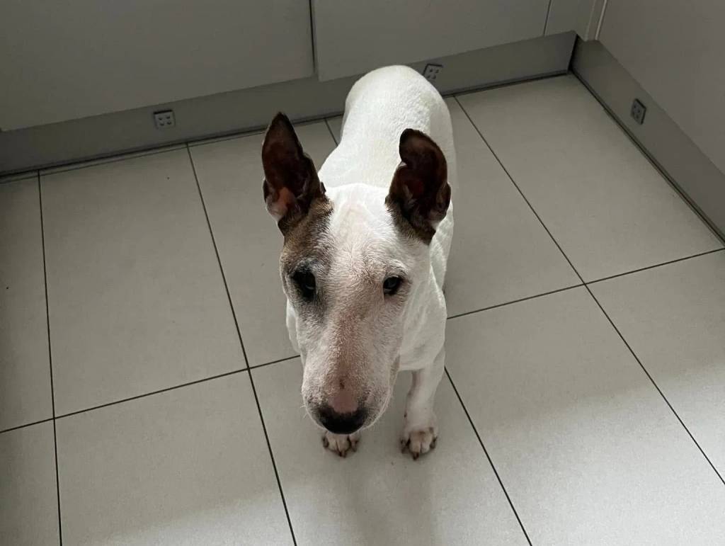 Un English Bulldog Terrier sur un sol carrelé et semblant détendu