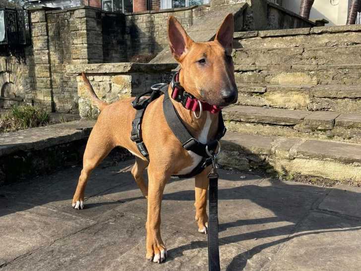 Un English Bulldog Terrier sur une surface bétonnée et qui est tenu en laisse