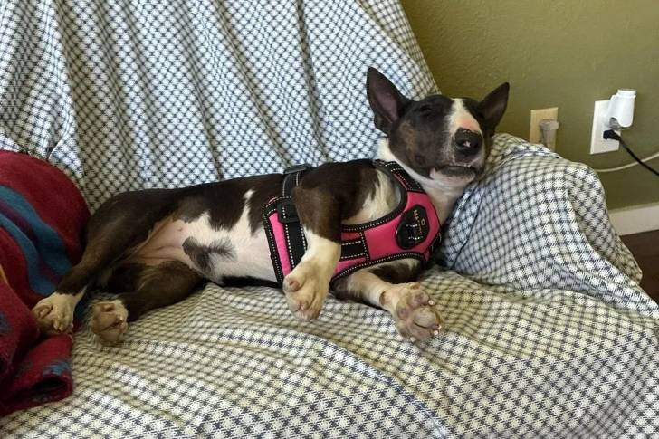 Un English Bulldog Terrier allongé sur un fauteuil et portant un harnais