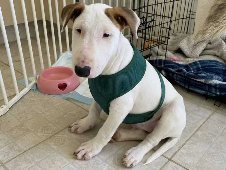Un English Bulldog Terrier assis sur un sol carrelé et portant un harnais