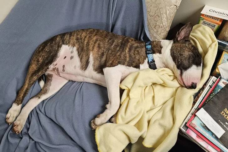 Un English Bulldog Terrier allongé et portant un collier autour du cou
