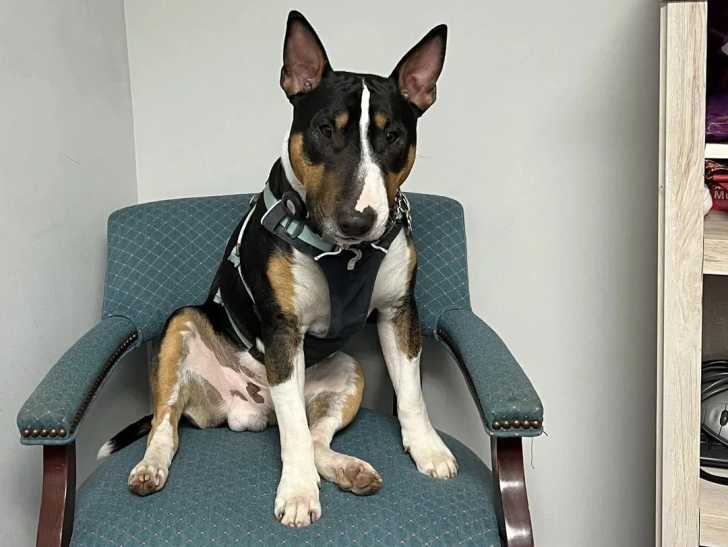 Un English Bulldog Terrier assis sur un fauteuil et portant un harnais