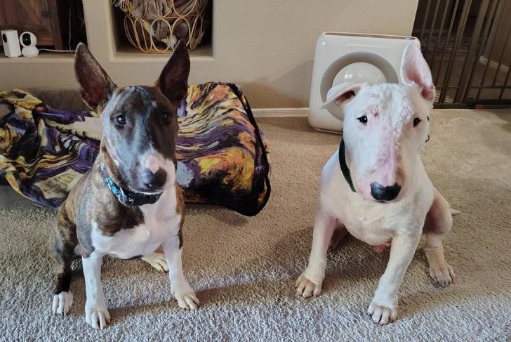 Dzux English Bulldog Terrier assis sur une moquette et portant tous deux un collier autour de leurs cou