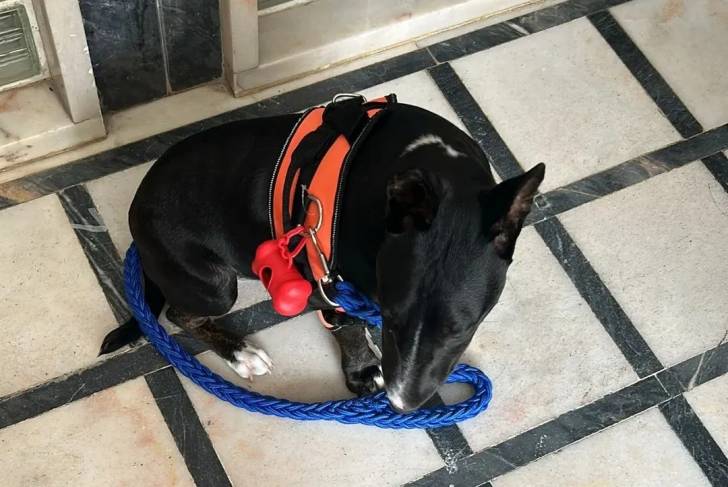Un English Bulldog Terrier allongé sur un sol carrelé et qui est tenu en laisse