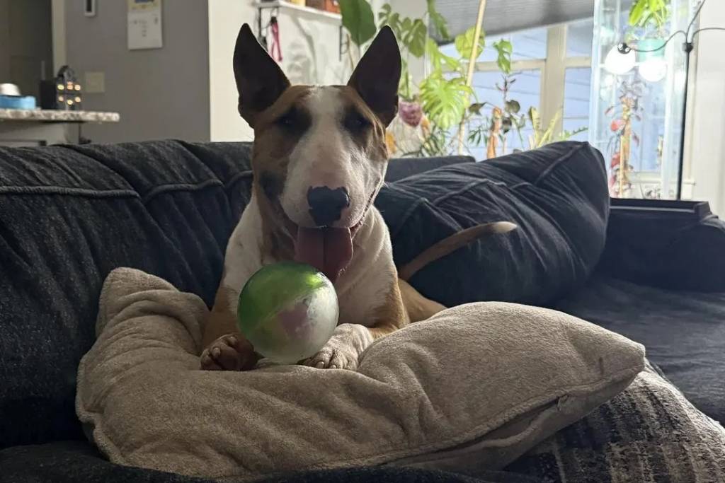 Un English Bulldog Terrier allongé sur un canapé et ayant la langue pendante