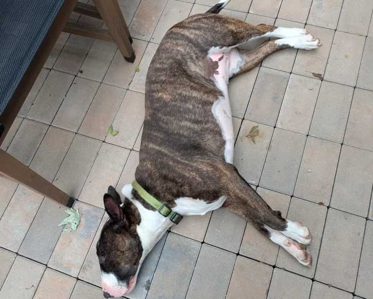 Un English Bulldog Terrier allongé sur un sol pavé et portant un collier autour du cou