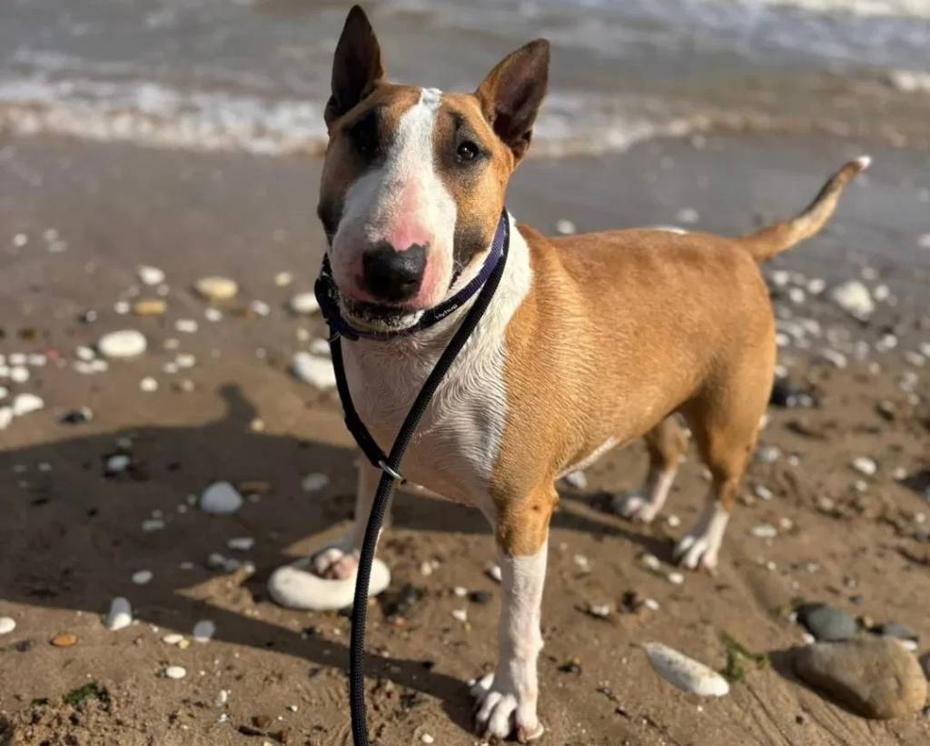 Un English Bulldog Terrier sur une surface sableuse et qui est tenu en laisse