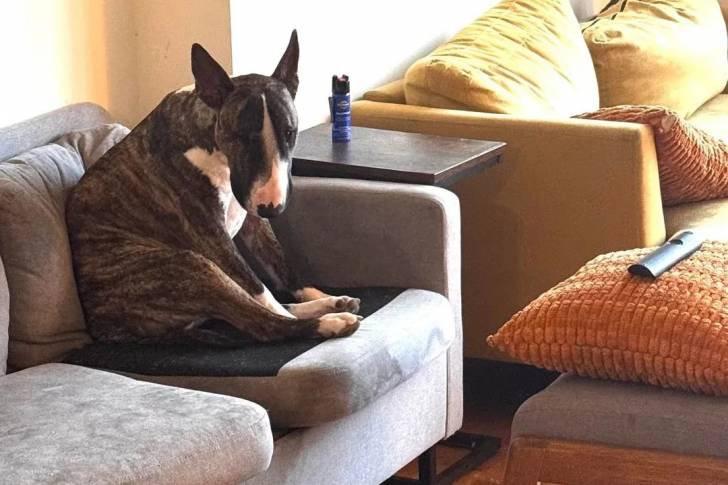 Un English Bulldog Terrier assis sur un canapé et semblant détendu