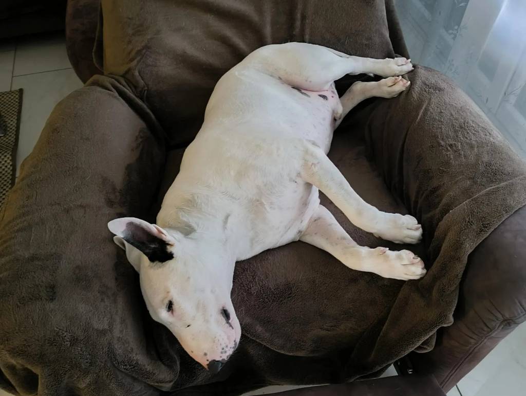 Un English Bulldog Terrier allongé sur un fauteuil et semblant détendu