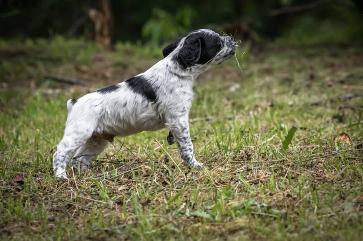 Séance de dressage d'un Épagneul Breton sur un terrain de chasse