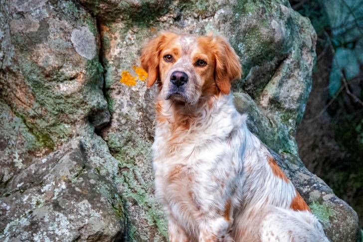 Un Épagneul Breton assis devant des rochers