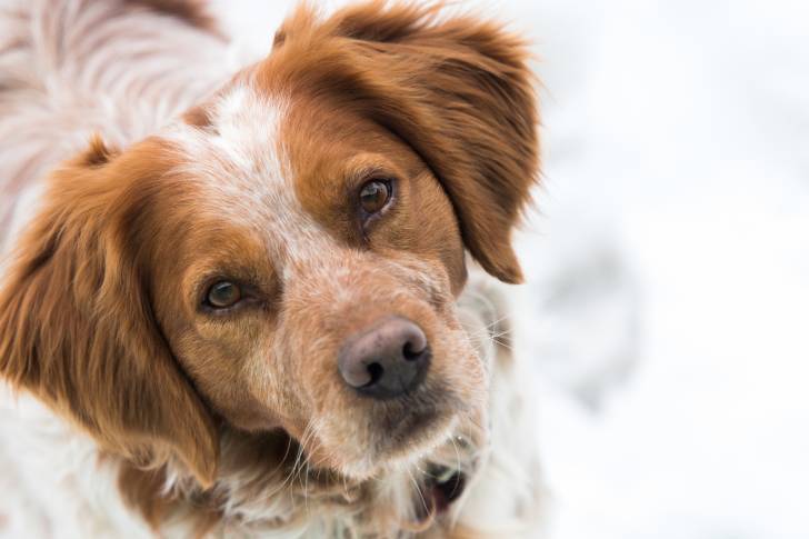 Un Épagneul Breton fauve pan blanc en train de regarder l'objectif