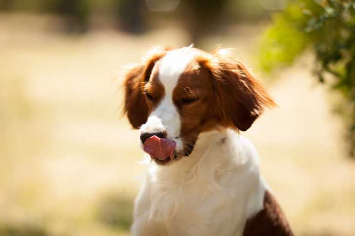 Un Épagneul Breton en train de se lécher les babines