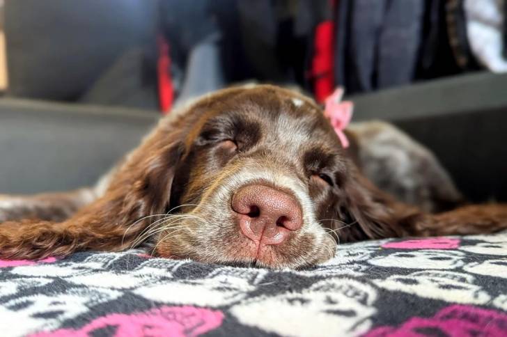 Un Épagneul de Chasse Polonais allongé sur un lit et semblant dormir