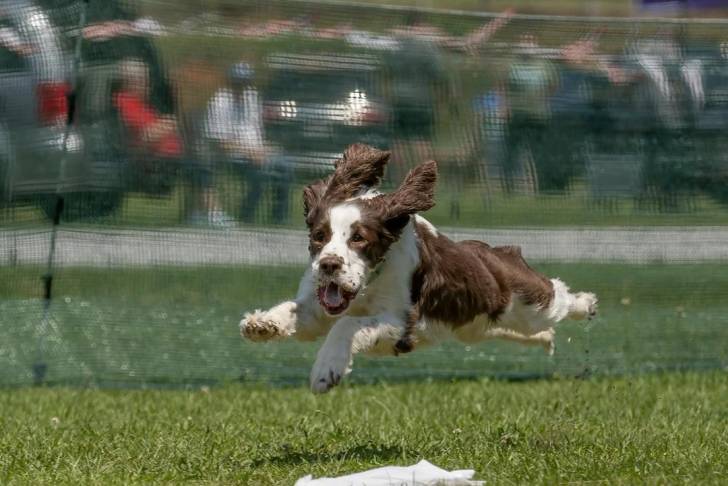 Un Épagneul de Chasse Polonais courant sur un terrain gazonné et ayant la gueule ouverte