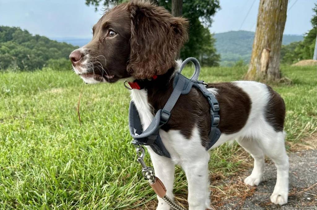 Un Épagneul de Chasse Polonais portant un harnais et qui est tenu en laisse