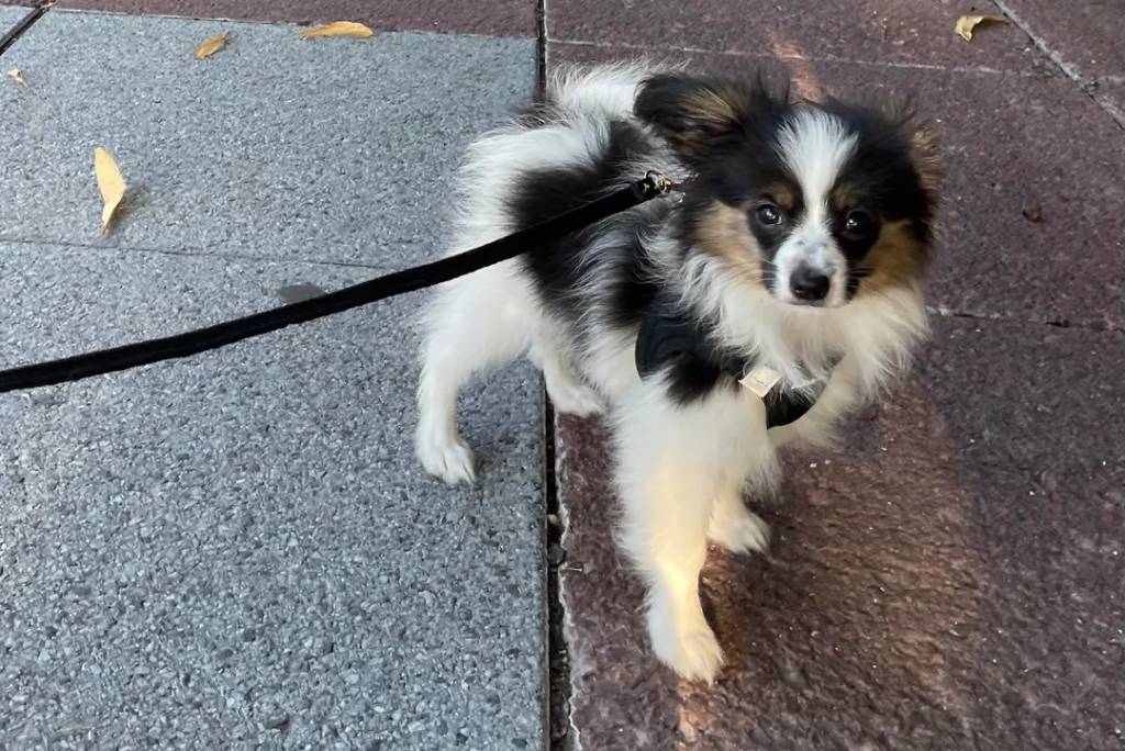 Un Épagneul Nain Continental Papillon sur une surface bétonnée et qui est tenu en laisse