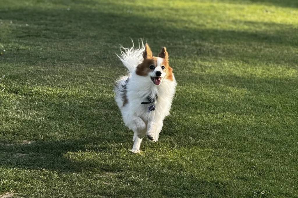 Un Épagneul Nain Continental Papillon courant sur une surface gazonnée et portant un collier autour du cou