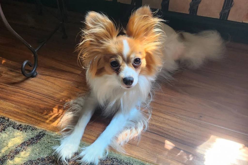 Un Épagneul Nain Continental Papillon allongé sur un plancher