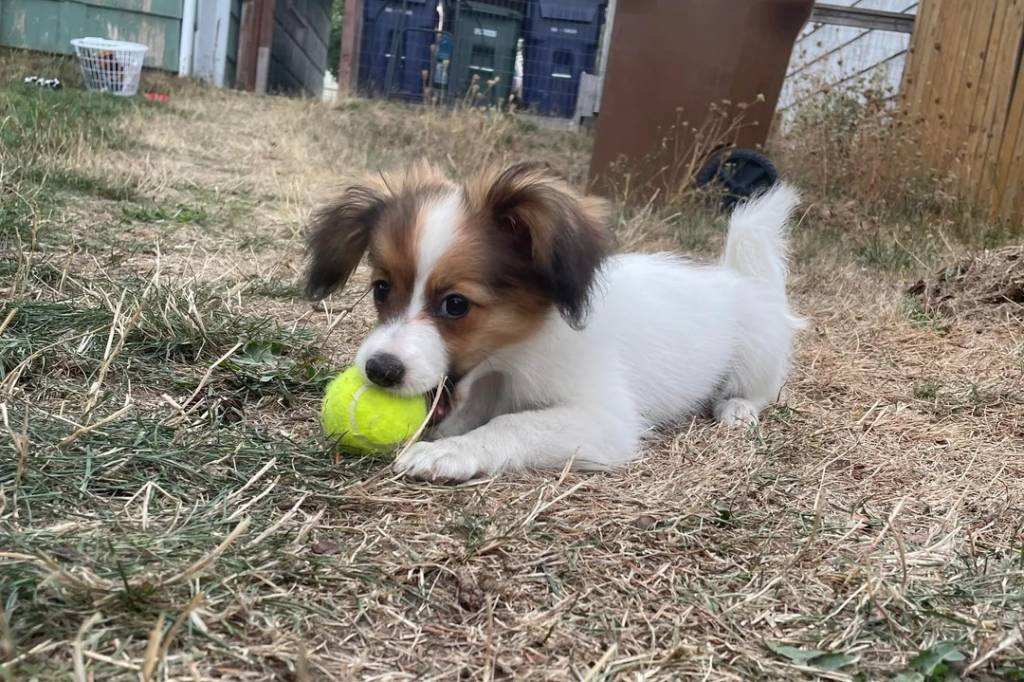 Un Épagneul Nain Continental Papillon allongé sur une surface herbacée et ayant une balle de tennis dans sa gueule