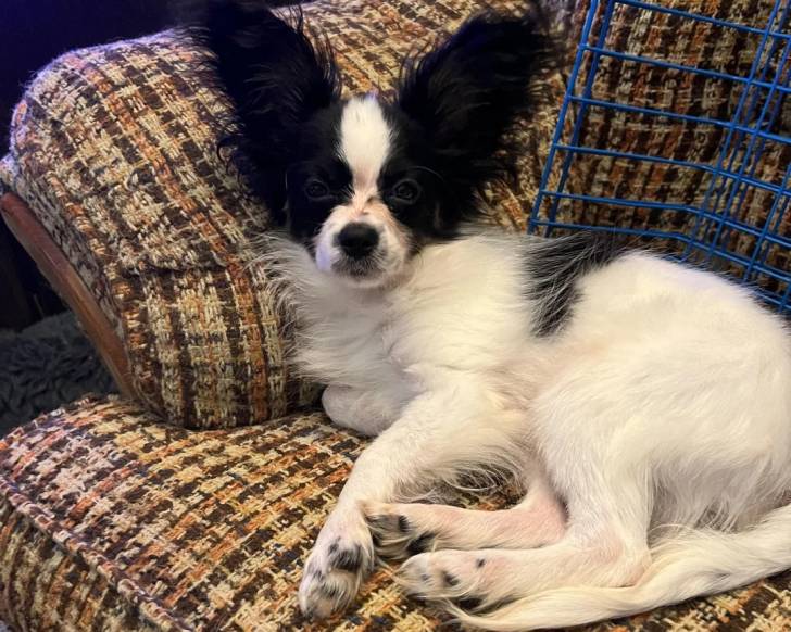 Un Épagneul Nain Continental Papillon allongé sur un canapé et regardant vers la caméra