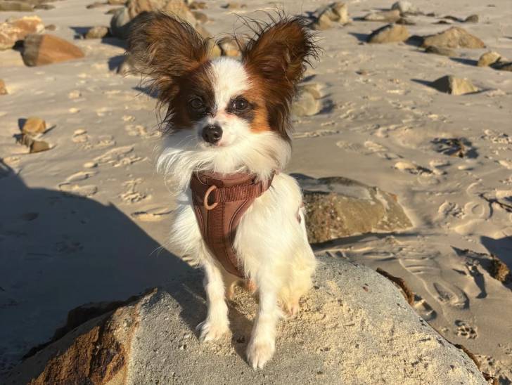 Un Épagneul Nain Continental Papillon regardant vers la caméra et portant un harnais