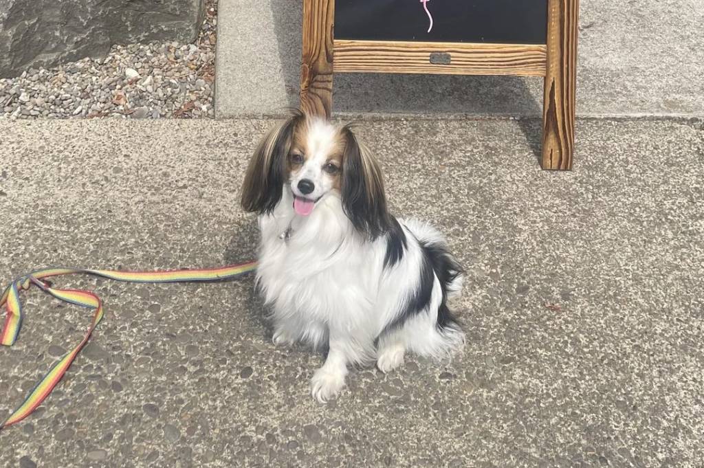 Un Épagneul Nain Continental Papillon sur une surface bétonnée et qui est tenu en laisse