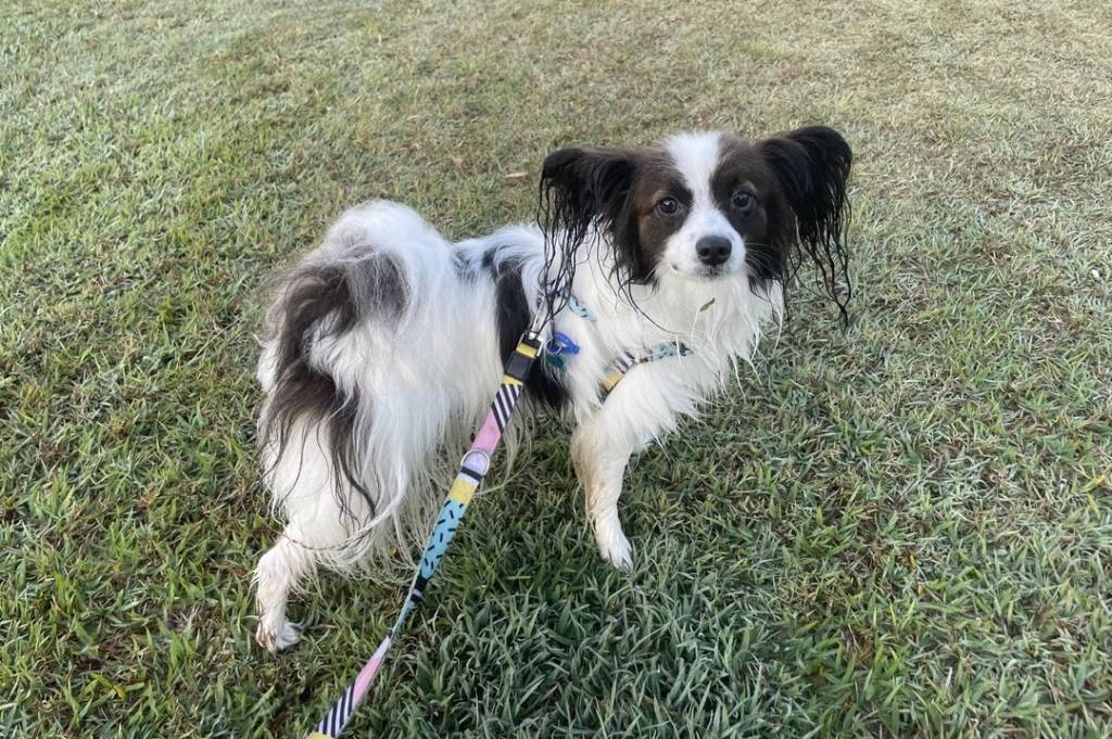 Un Épagneul Nain Continental Papillon regardant vers la caméra et qui est tenu en laisse