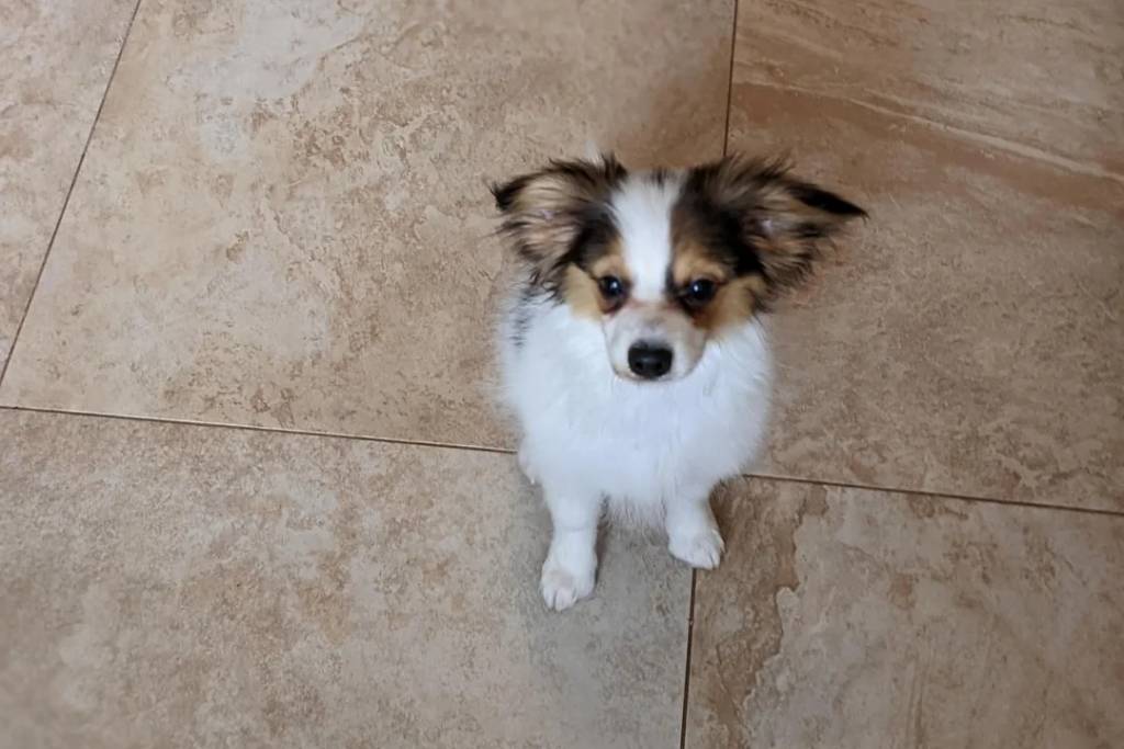 Un Épagneul Nain Continental Papillon assis sur un sol carrelé et regardant vers la caméra
