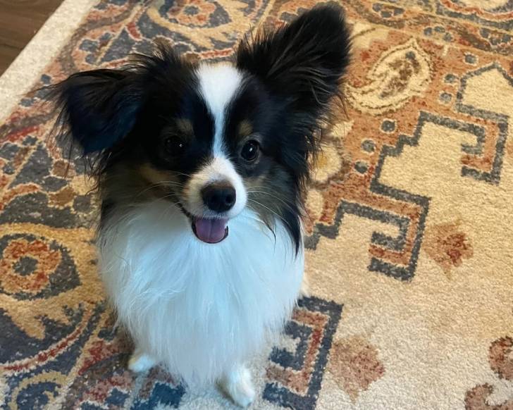 Un Épagneul Nain Continental Papillon assis sur un tapis et tirant la langue